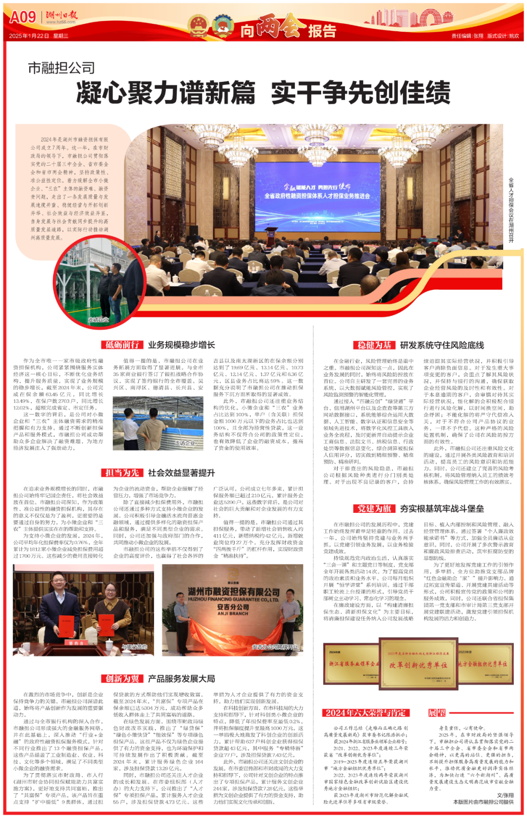 2024年是湖州市融资担保有限公司成立7周年。这一年,在市财政局的领导下,市融担公司贯彻落实党的二十届三中全会、省市委全会和省市两会精神,坚持政策性、准公益性定位,着力缓解全市小微企业、“三农”主体的融资难、融资贵问题,走出了一条发展质量与发展速度并重、稳健经营与开拓创新并举、社会效益与经济效益并显,自身发展与社会贡献同步提升的高质量发展道路,以实际行动推动湖州高质量发展。